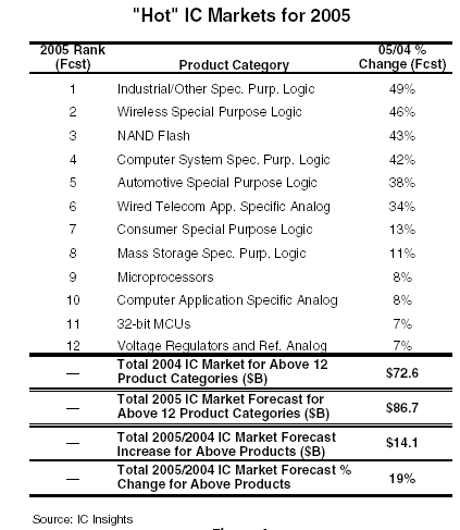 分别预测了2005年十大热门IC产品和十大非热门IC产品。